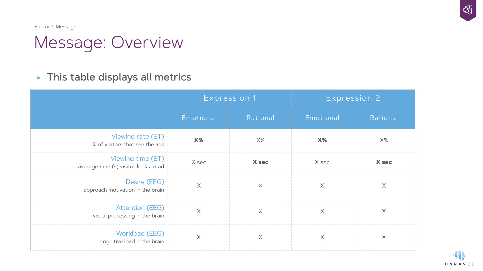 During a communication study, we measure the score of your expression(s) on various neuro KPIs. The main metrics are: