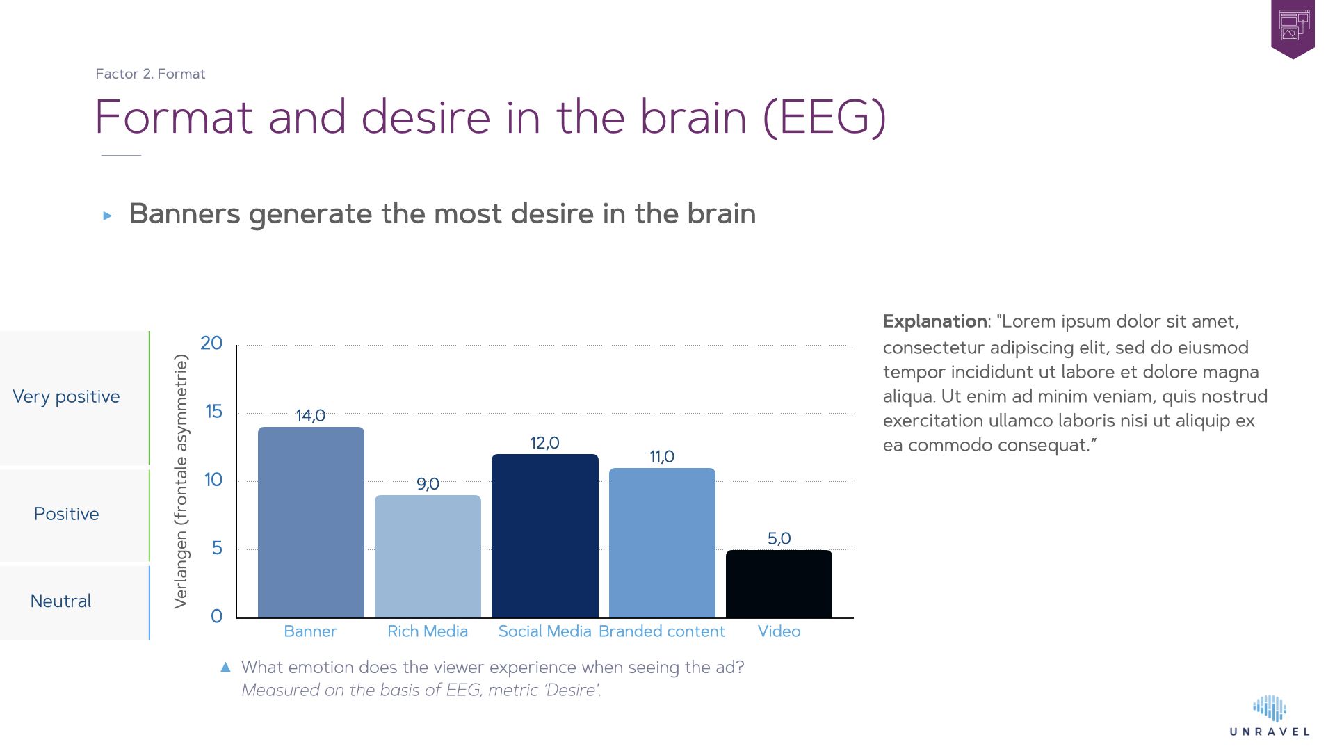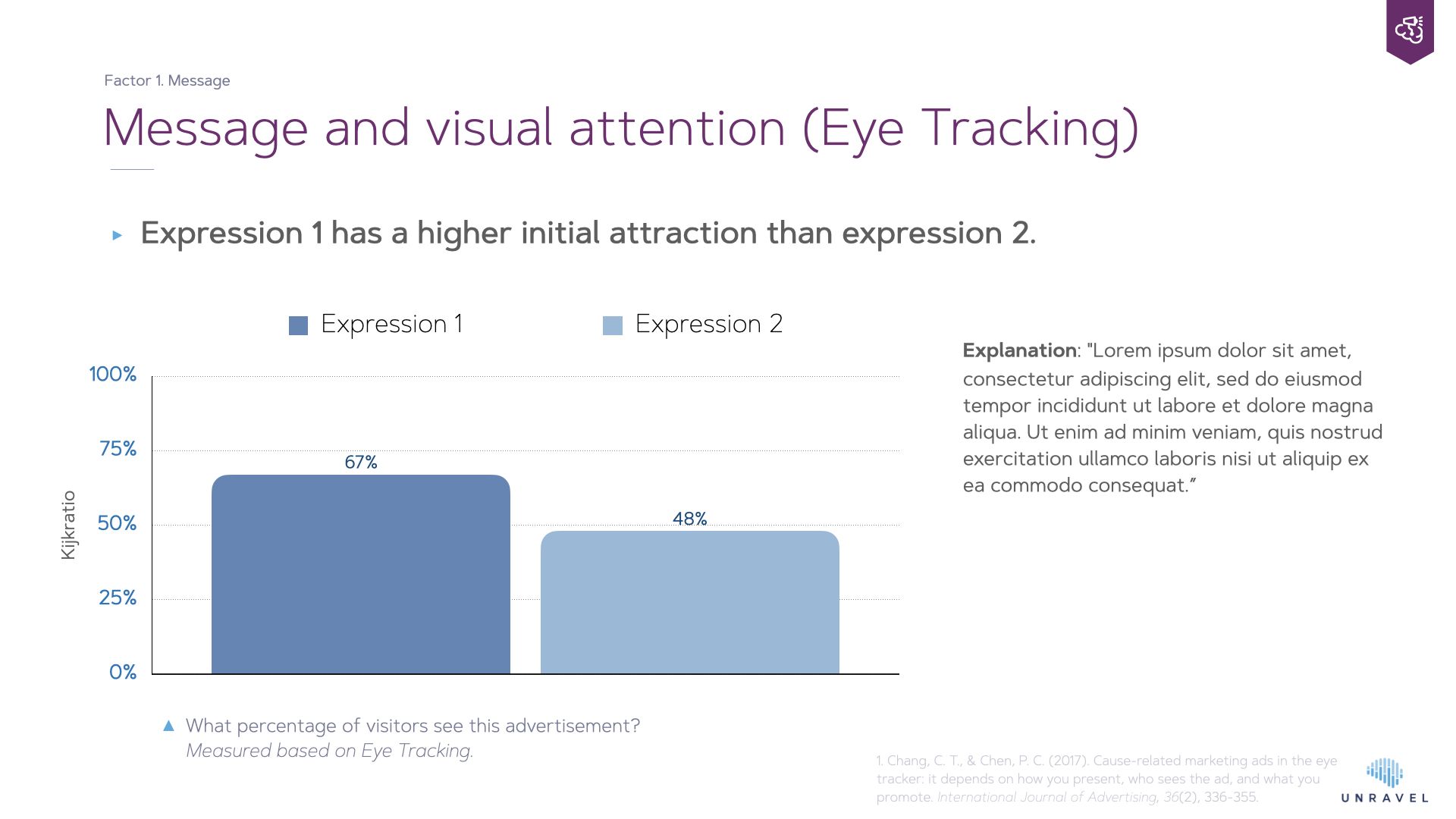 The brain often processes communications quickly and automatically. Especially online, where numerous expressions compete with each other to capture our attention. We are therefore often not aware of our reactions to an expression, even though they do affect our behavior. Neuro communication research with EEG and Eye Tracking makes it possible to objectively measure what kind of reactions your expression actually triggers.
